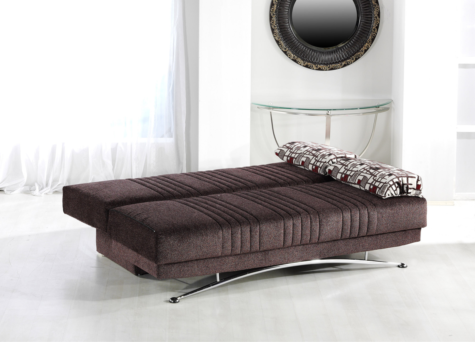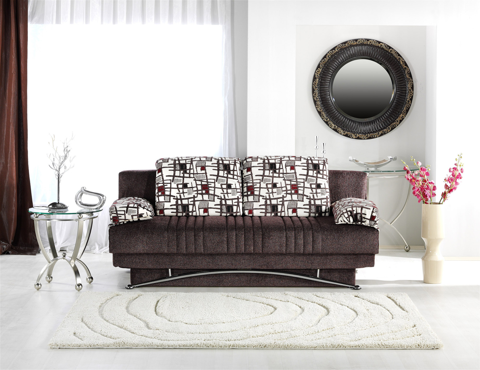 With bold trendsetting details, the Fantasy Sleeper sofa is simply iconic. A contemporary design is emphasized by tailored pleating, organic lines, and a curvy chrome crossbar. Removable bolster pillows and back cushions feature attractive patterns for a distinctive look that stands out in any space. This sofa features built-in storage and a fold-out sleeper bed for ultimate convenience.